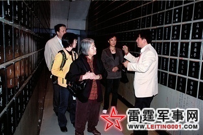 731部队罪证陈列馆馆长金成民(右一)向山边悠喜子(中)介绍731部队细菌战及人体实验受害者牌位。